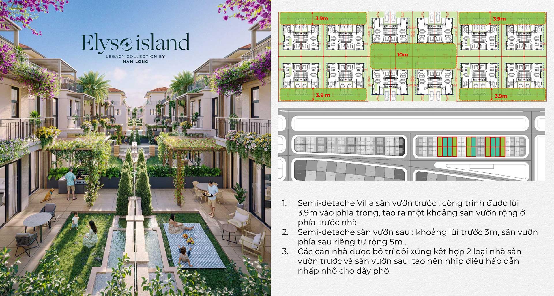 • Garden Villa (Biệt thự vườn Elyse): 58 căn – diện tích 20 x 20m, 3 tầng, mật độ xây dựng 30%.