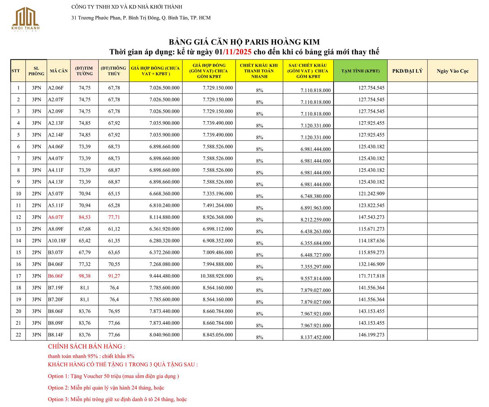Bảng giá căn hộ Paris Hoàng Kim tháng 11/2025